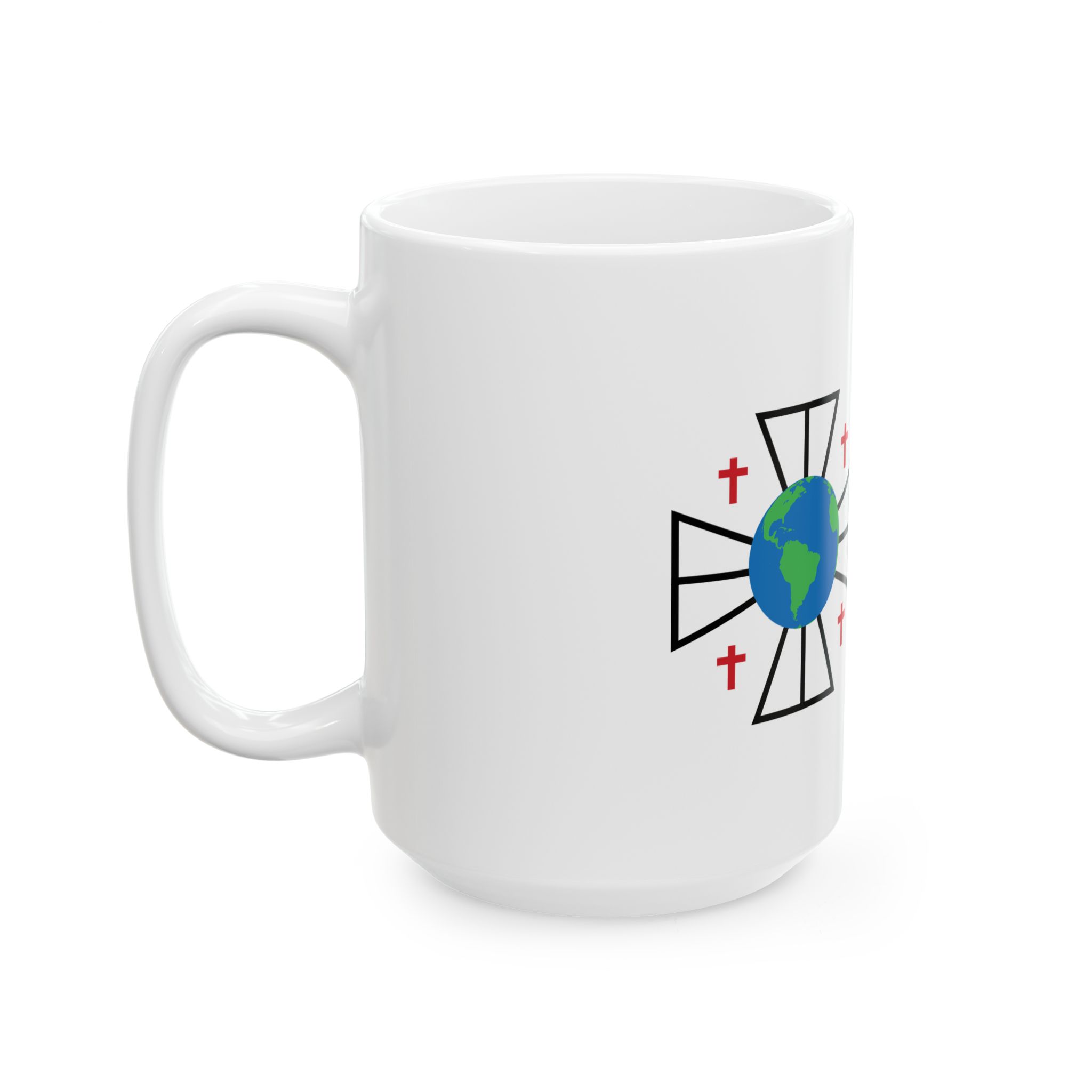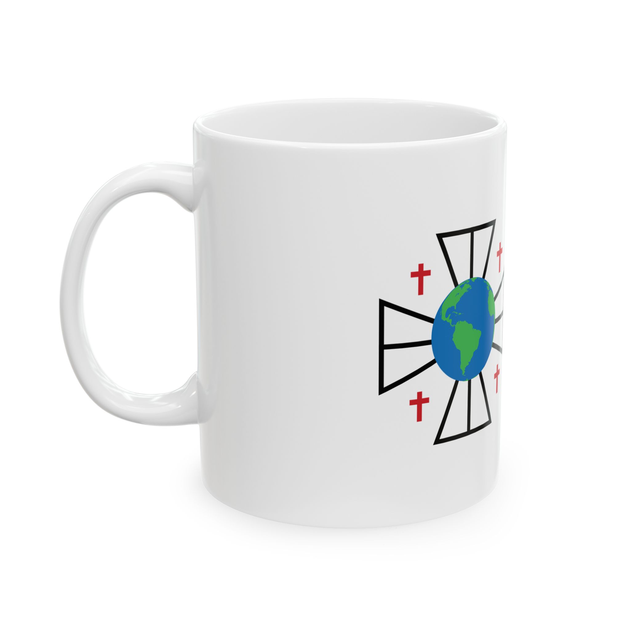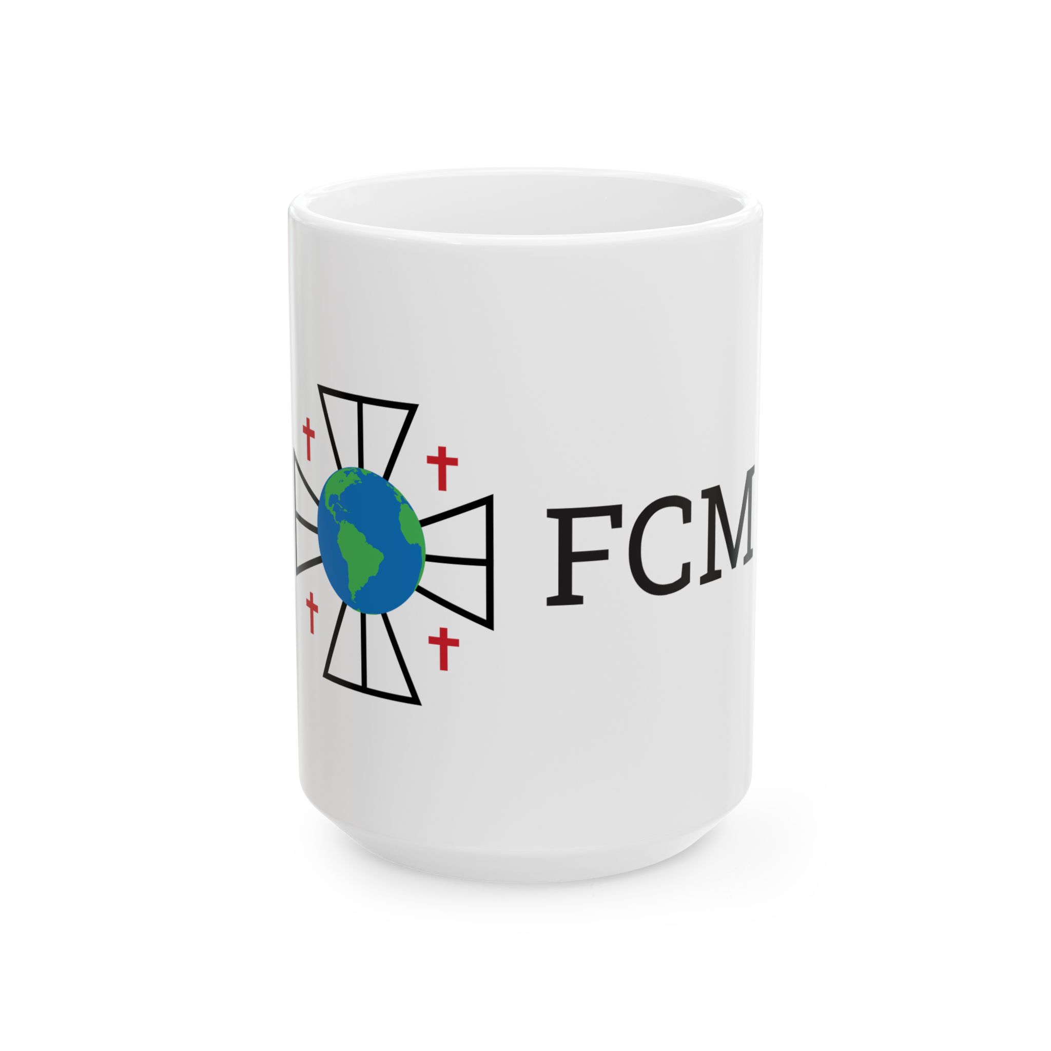 Warm, steady, and quietly bold — this ceramic mug brings faith to your morning ritual. Crisp printing wraps a simple emblem: the FCM logo, rendered in bright, lasting color. The glossy white ceramic makes the design pop while the comfortable C-handle fits easily in hand. Use it for early devotion time, on the church office desk, or during fellowship over coffee. It feels familiar in a pew-side kitchen and reliable on weekday mornings, a small reminder of community and mission each time you sip.