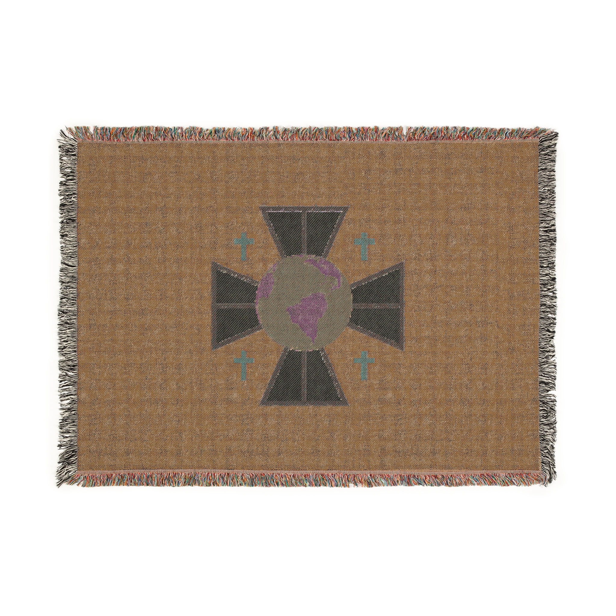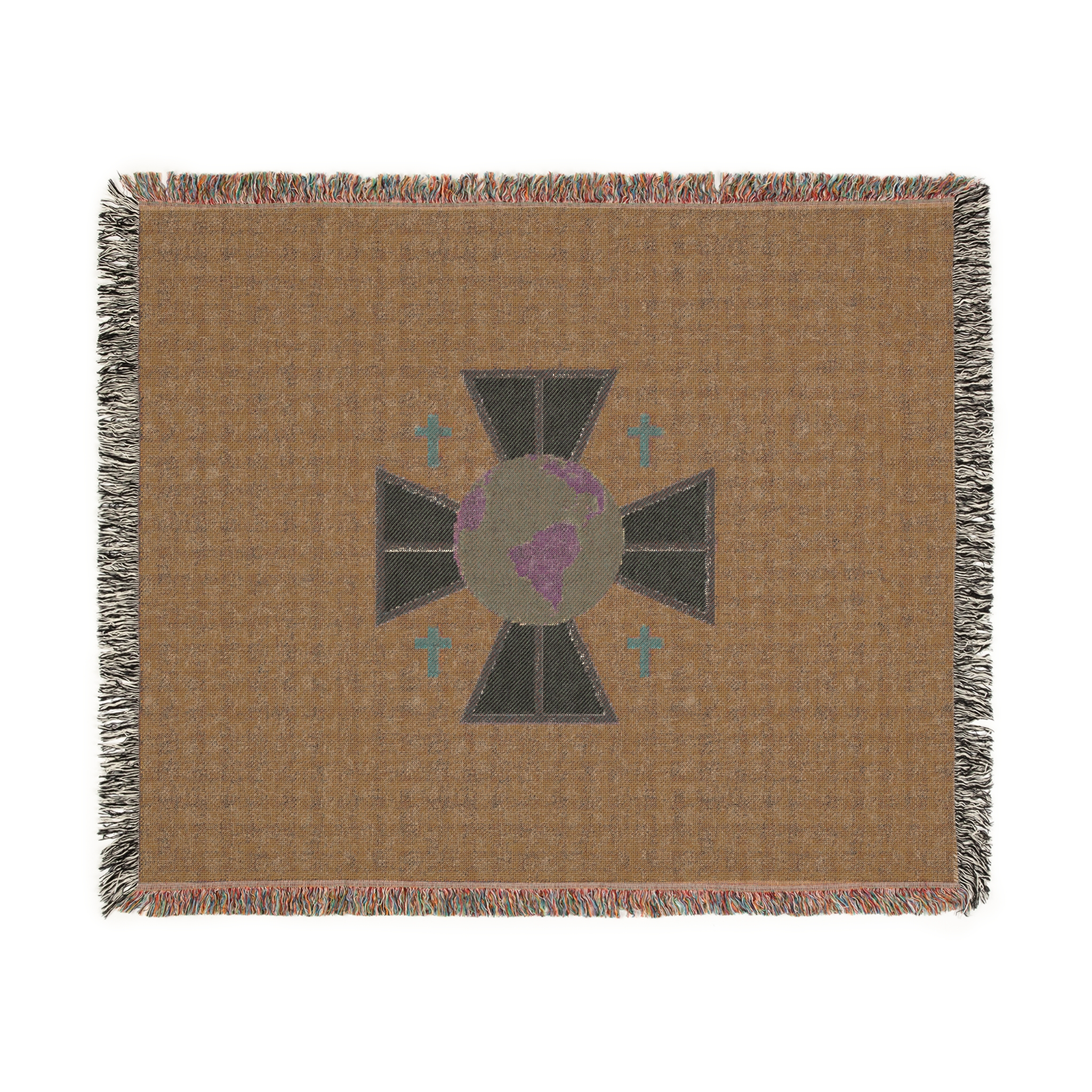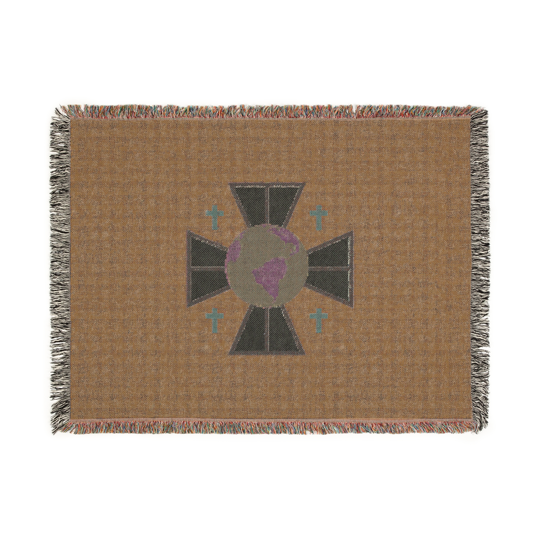 A cozy woven blanket that brings quiet symbolism and soft texture into everyday moments. Handwoven cotton threads create a tactile, slightly rustic surface framed by colorful fringed edges. The central emblem — the FCM logo — feels contemplative and worldly, lending the blanket an understated, meaningful presence on a sofa, reading chair, or layered at the foot of a bed. Available in three sizes, it drapes with natural weight and warmth, inviting slow evenings, reflective mornings, and thoughtful gatherings.