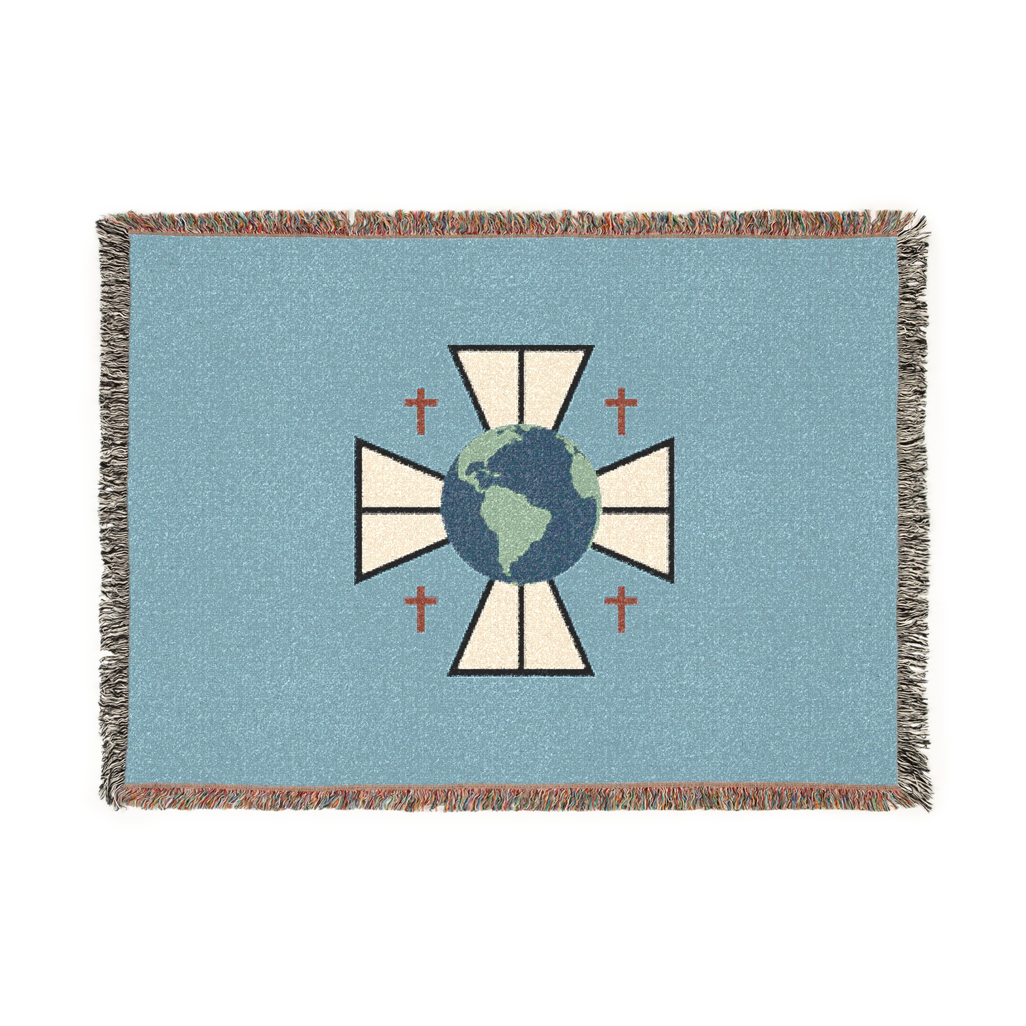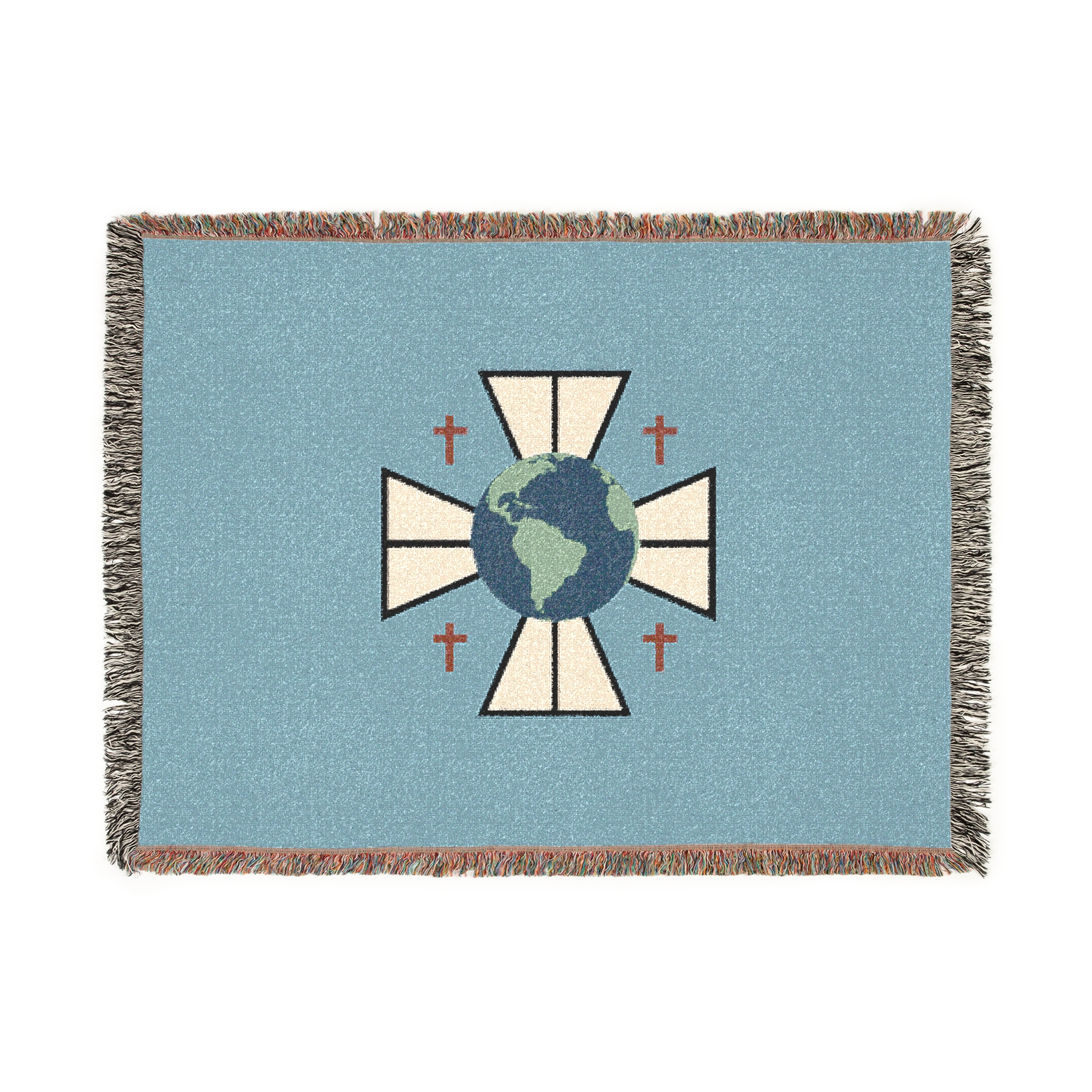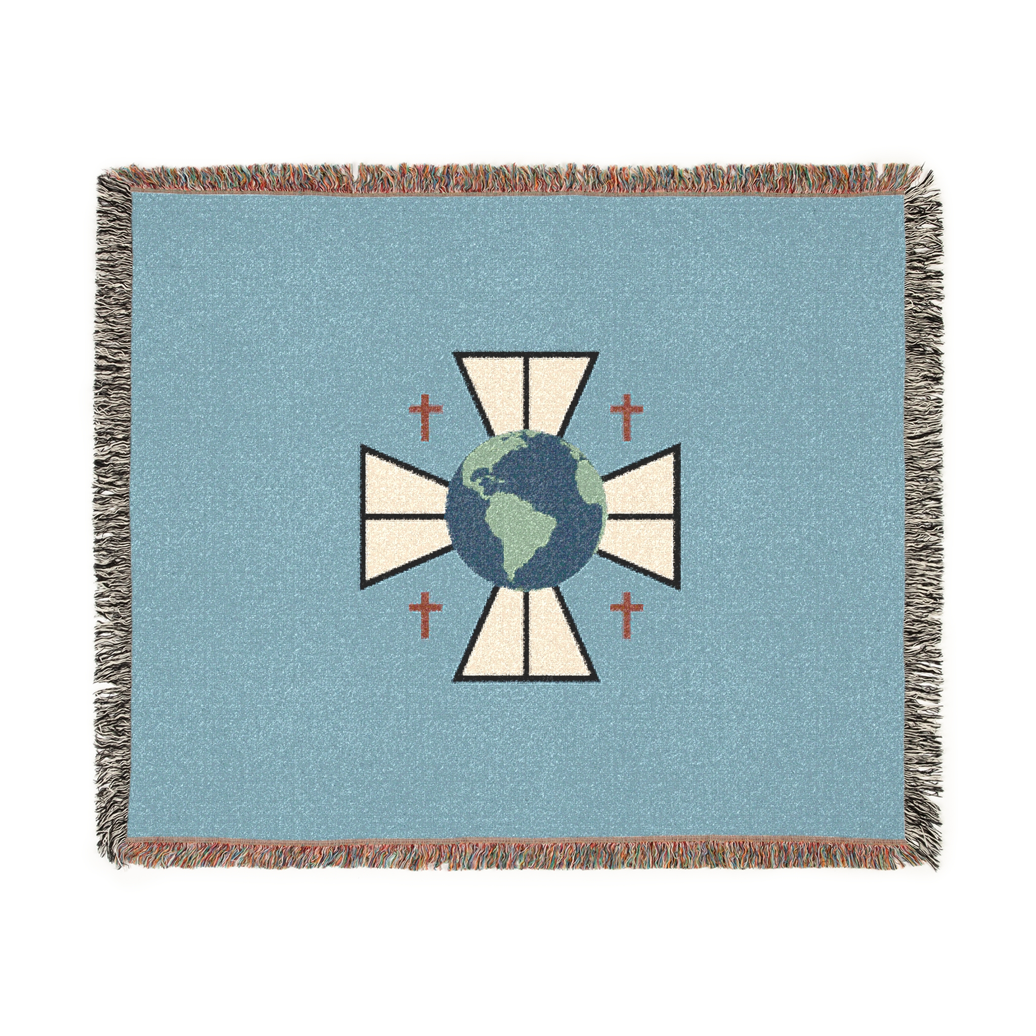 A cozy woven blanket that brings quiet symbolism and soft texture into everyday moments. Handwoven cotton threads create a tactile, slightly rustic surface framed by colorful fringed edges. The central emblem — the FCM logo — feels contemplative and worldly, lending the blanket an understated, meaningful presence on a sofa, reading chair, or layered at the foot of a bed. Available in three sizes, it drapes with natural weight and warmth, inviting slow evenings, reflective mornings, and thoughtful gatherings.